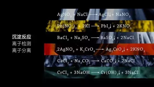 本视频中包括了6个沉淀反应,沉淀反应主要用于离子检测和离子分离。比如向一种溶液中滴入氯化钠溶液可以产生白色沉淀,那么这种溶液中很可能含有银离子。如果向含有钡离子的溶液中滴入过量的硫酸钠溶液,再过滤掉生成的硫酸钡沉淀,就可以去除原溶液中的钡离子。另外沉淀反应是一种离子反应,使用离子方程式可以更直观地反映沉淀反应的实质。